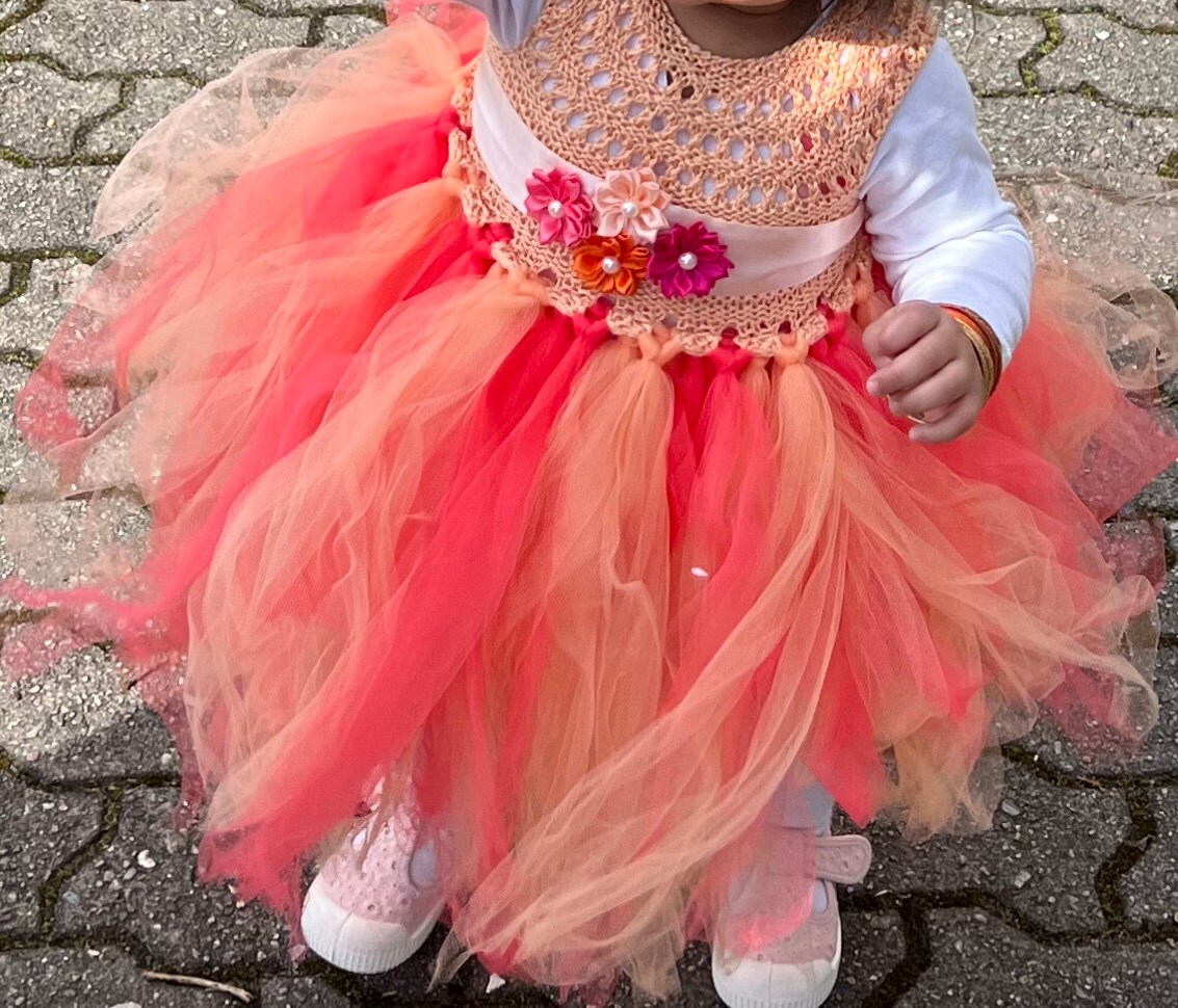 This dress is made to order! The sizing on all our dresses is fairly versatile due to the stretch of the hand knitted top in the chest and waist, adjustable back with ribbon and removable waistband, but for the best fit, we recommend you to measure your child.